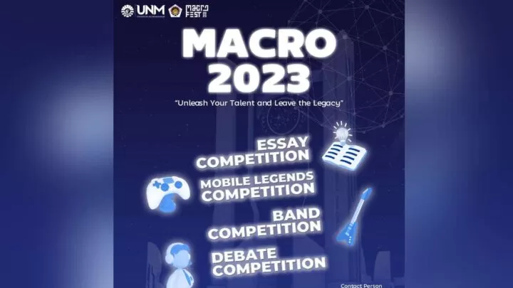 Macro 2023 akan mempertemukan siswa SMA dan Mahasiswa se Sulawesi Selatan dalam rangkaian kegiatan mulai dari lomba, seminar dan expo. Item lomba yang akan diadakan yaitu lomba essay, band, debat dan tournament mobile legends. Untuk juknis dari setiap kegiatan bisa diakses melalui link https: //bit.ly/juklakjuknismacro