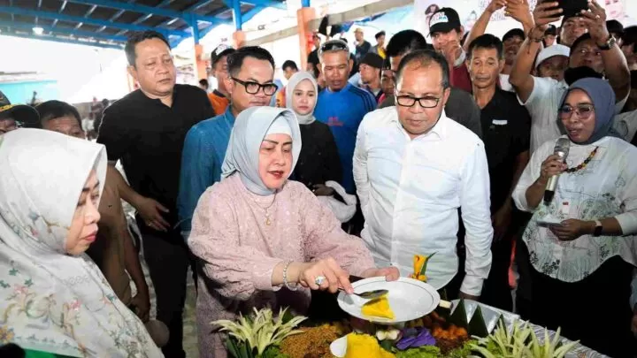 Ketua TP PKK Indira Yusuf Ismail bersama Walikota Makassar Moh Ramdhan Pomanto pun diminta melakukan memotong tumpeng sebagai bentuk syukuran dan apresiasi masyarakat.